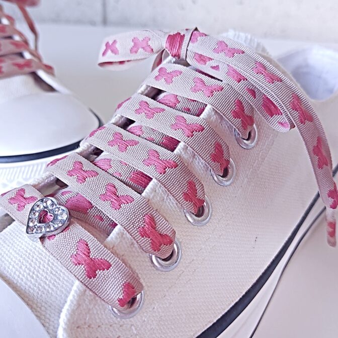 ●やわらかいベージュ地にくすみピンクの蝶々の刺繍が並んだリボンを靴紐にしました♪