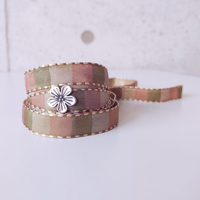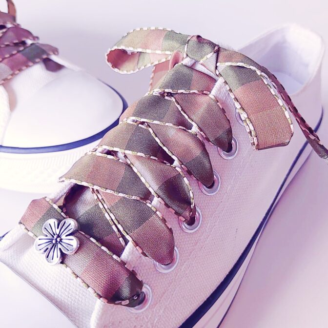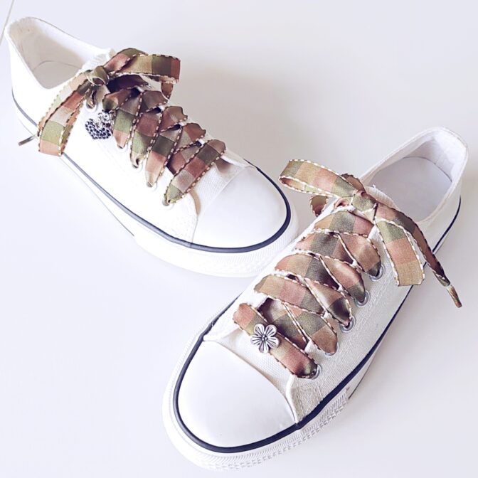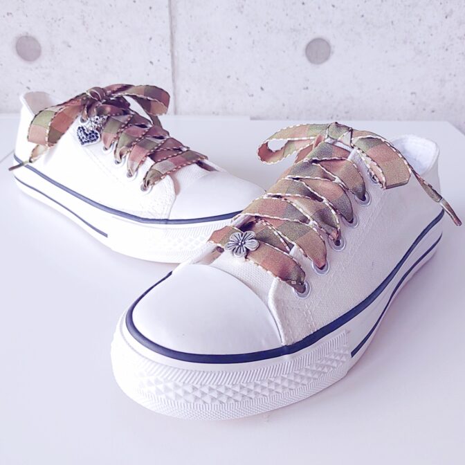 ●ベージュ&オリーブ&カーキがスクエア型で順に並んでいるリボンを靴紐にしました♪