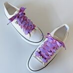 ●淡いパープルから赤みがかったパープルのグラデーションに、赤のステッチが縁に入ったリボンを靴紐にしました♪