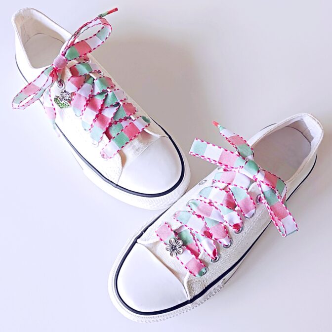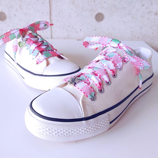 ●白&赤&緑がスクエア型で順に並んでいるリボンを靴紐にしました♪