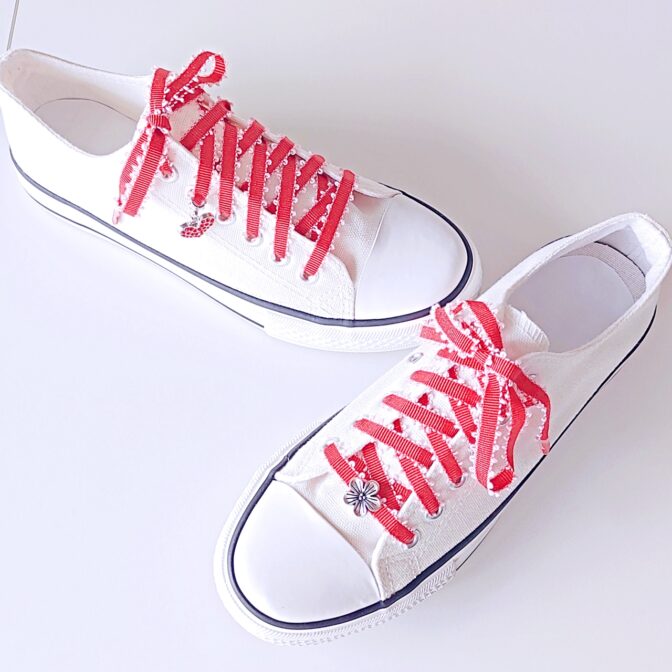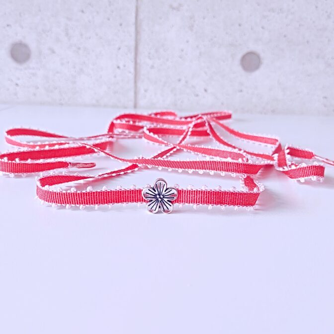 キュートレッド シルバー色花チャーム付き (リボンシューレース)