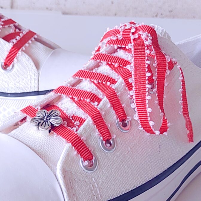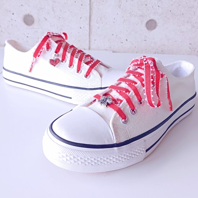 ●キュートな赤にピコット付きのデザインの靴紐です。スニーカーファッションのポイントに、かわいい元気さを演出できそうです。カジュアルなデニムなどのスカートにも合わせられそう♥