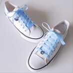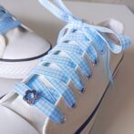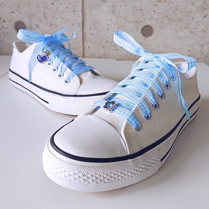 ●永遠の定番、みんな大好きギンガムチェックのリボンをシューレースにしました。水色が爽やか。特別なシューレースをつけてスニーカーファッションを楽しんで♪