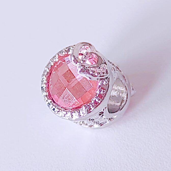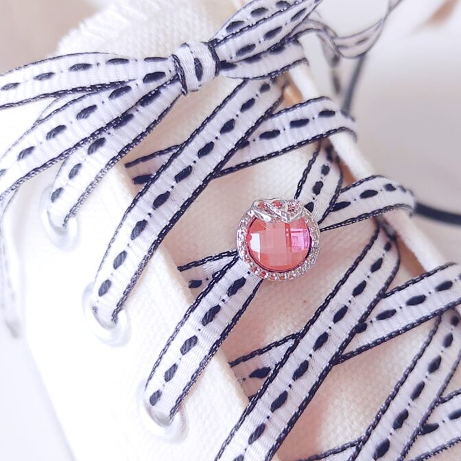 ●クリアなピンクのジュエリーチャームにシルバーのハートをあしらった可憐なデザインのシューレースチャームです。