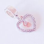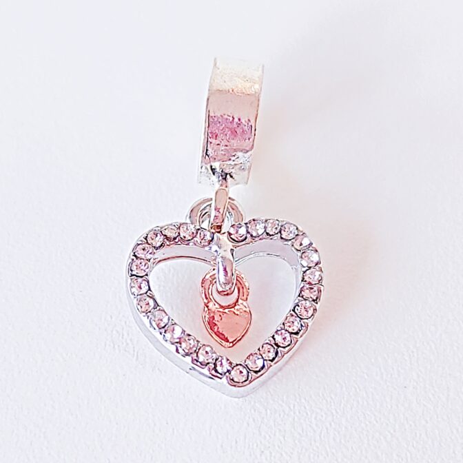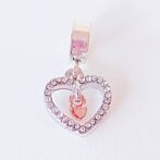 ●シルバー色にぐるっとラインストーンがはめ込まれたオープンハートに、ピンクゴールド色の小さなハートがぶら下がったかわいいシューレースチャーム。