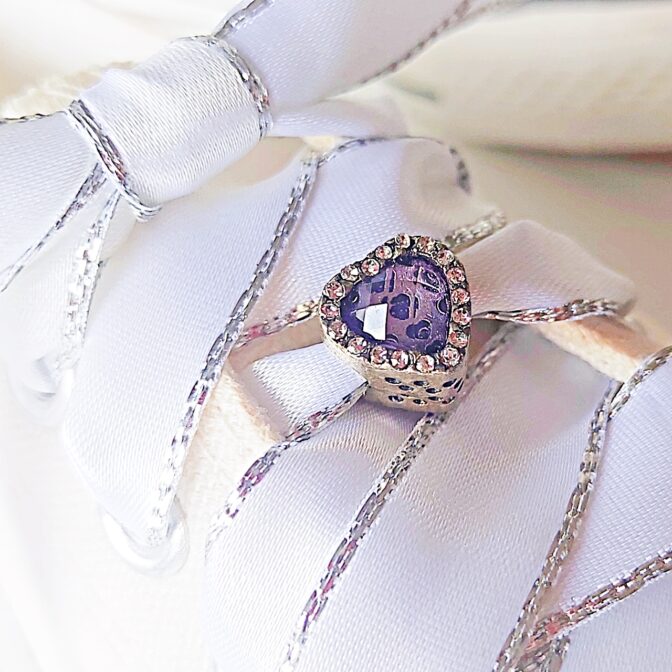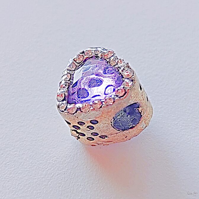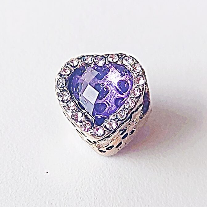 ●エレガントで女性らしい紫色のハート型に、透明のラインストーンのふちどりが華やかなシューレースチャームです。