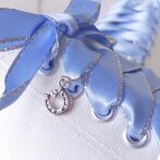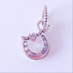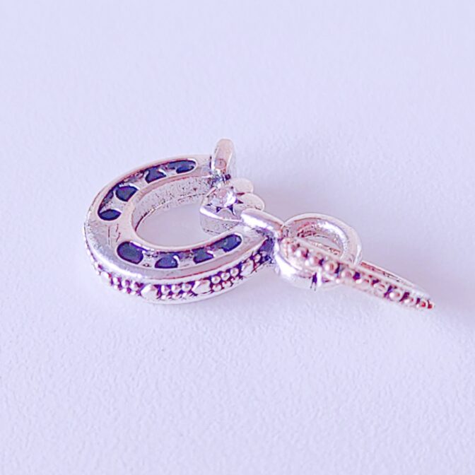 ●シルバー色のホースシューのモチーフ。真ん中にラインストーンを埋め込んだ小さなハートも加わったデザインのシューレースチャームです。