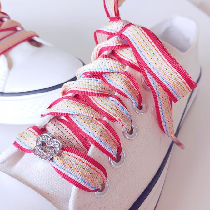 ●キャンディー包みみたいな明るい色のリボンをシューレースにしました。赤の縁取りに、水色、イエロー、黄緑、オレンジのステッチが入っています♪