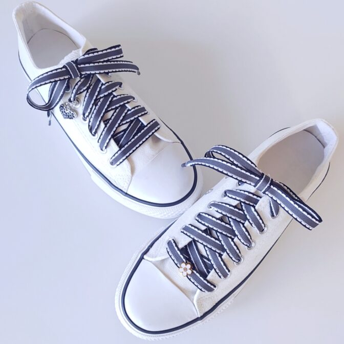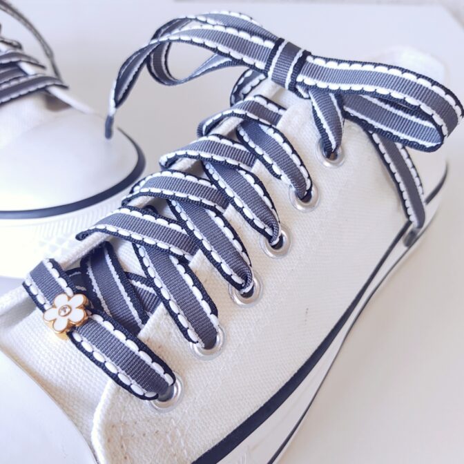 ●グレーに黒の縁取り、あいだに入った2本の白のステッチがフリルのようにも見えるきれいなリボンをシューレースにしました♥