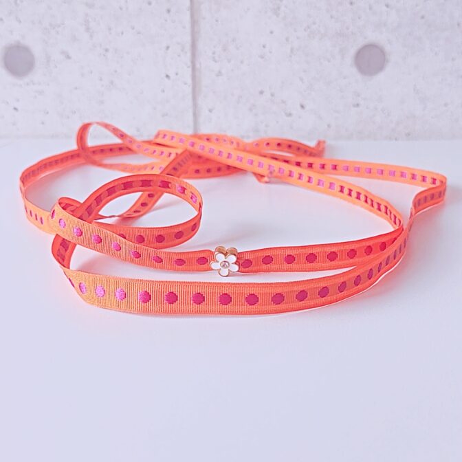 ●オレンジのリボンに、ショッキングピンクのドット柄の刺繍が入ったリボンを靴紐にしました!