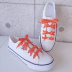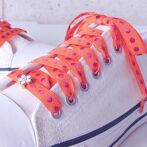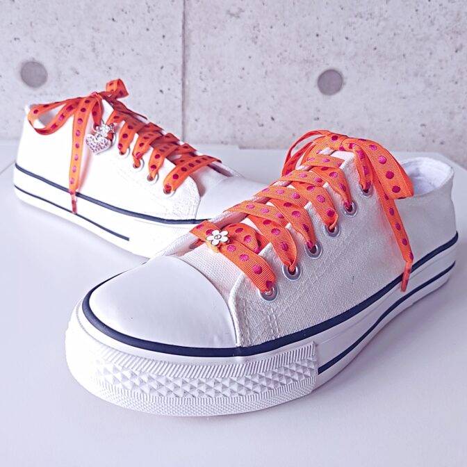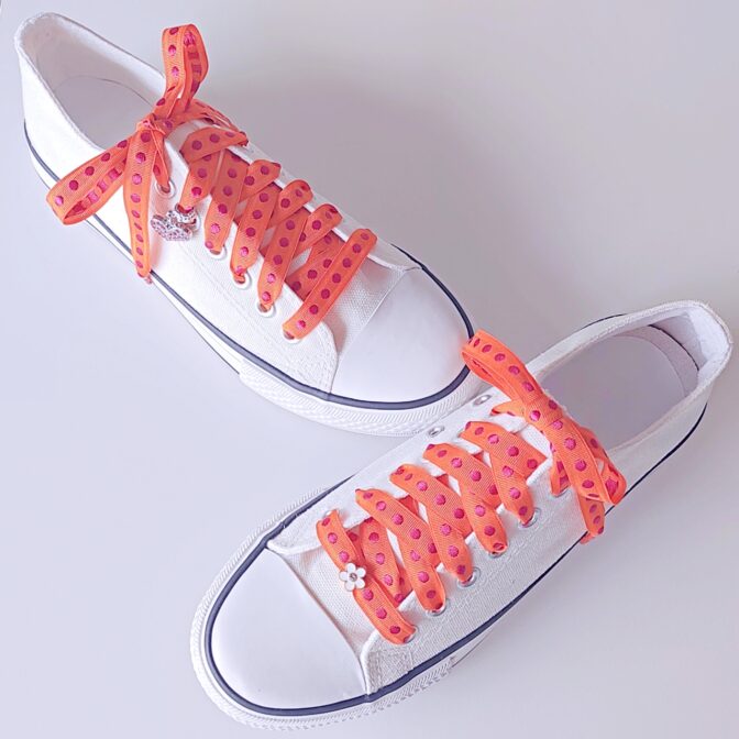 ●明るいオレンジ色に、乙女な濃いピンクの水玉刺繍のシューレースです。スニーカーファッションのポイントに、足元をポップにかわいくしてくれます♪