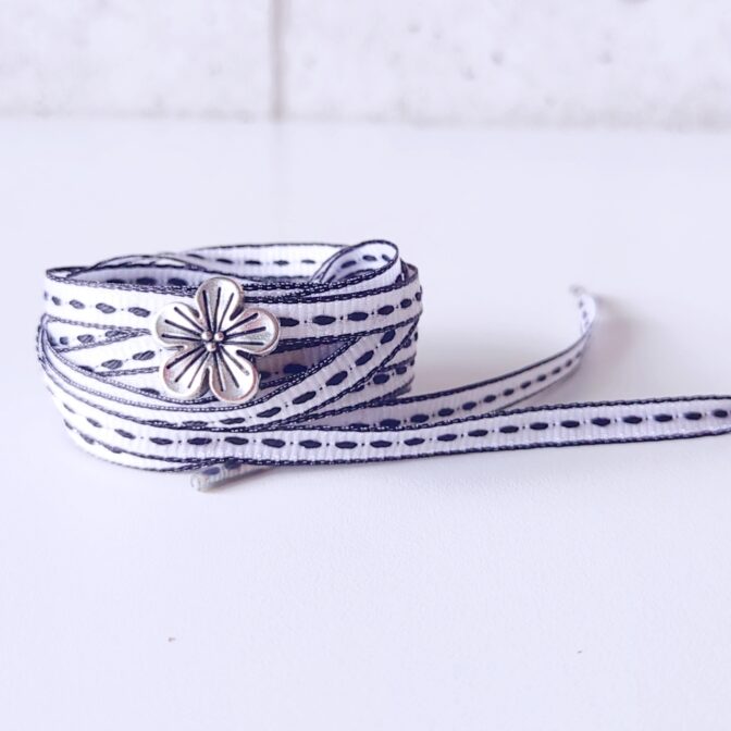●白地に、黒の縁取りと中央にステッチが入った細めリボンでつくった靴紐です♪