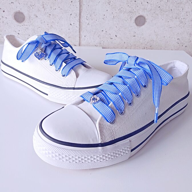 ●きれいな青のチェックのリボンをシューレースにしました。澄み切った爽やかな色がカジュアルなスニーカーファッションにぴったり♥